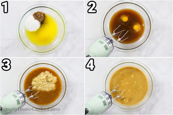 - Now, in a separate bowl, mash up 4 ripe bananas (medium-sized). Then mix them into the batter.