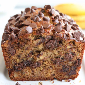 This Chocolate Chip Banana Bread is moist, sweet, and chocolaty. Its banana flavor is complemented by the rich brown sugar, walnuts, and plump chocolate chips.