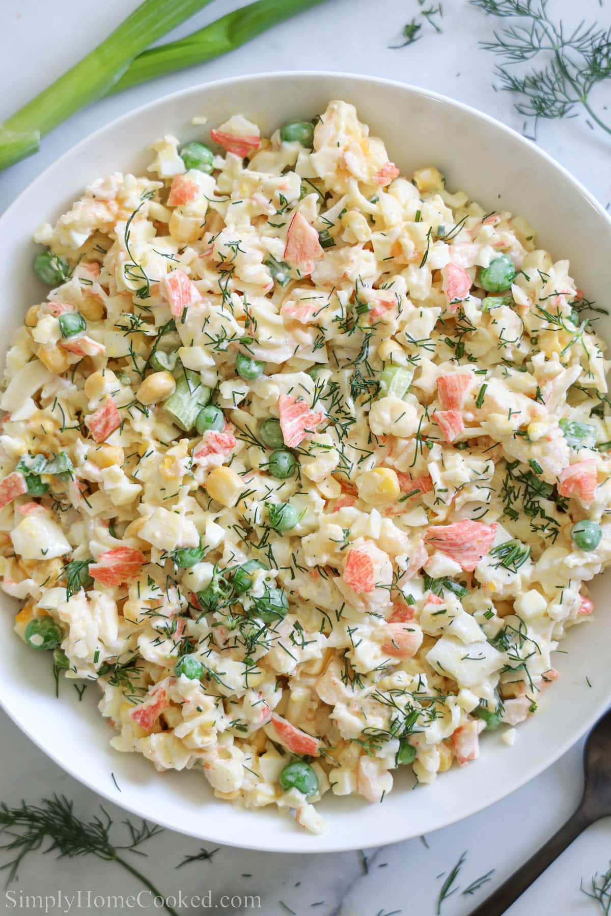 - Chop up the seafood, eggs, and vegetables. Chop the crab and shrimp and place them in a large bowl. Now do the same for the hard-boiled eggs, green onion, and fresh dill. Then add in the corn and peas.