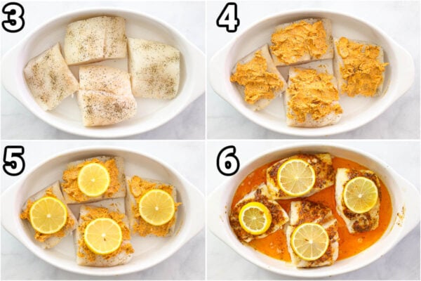 - Place the seasoned cod into a small deep baking dish and evenly spread the butter mixture on top.