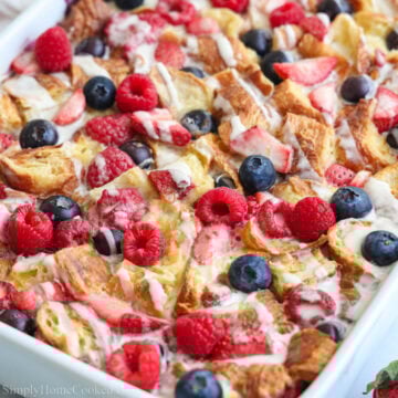 This Sweet Croissant Breakfast Casserole is full of fresh berries, toasted buttery croissants, and rich custard. Drizzled with a lemon glaze, it’s a sweet take on a savory classic.