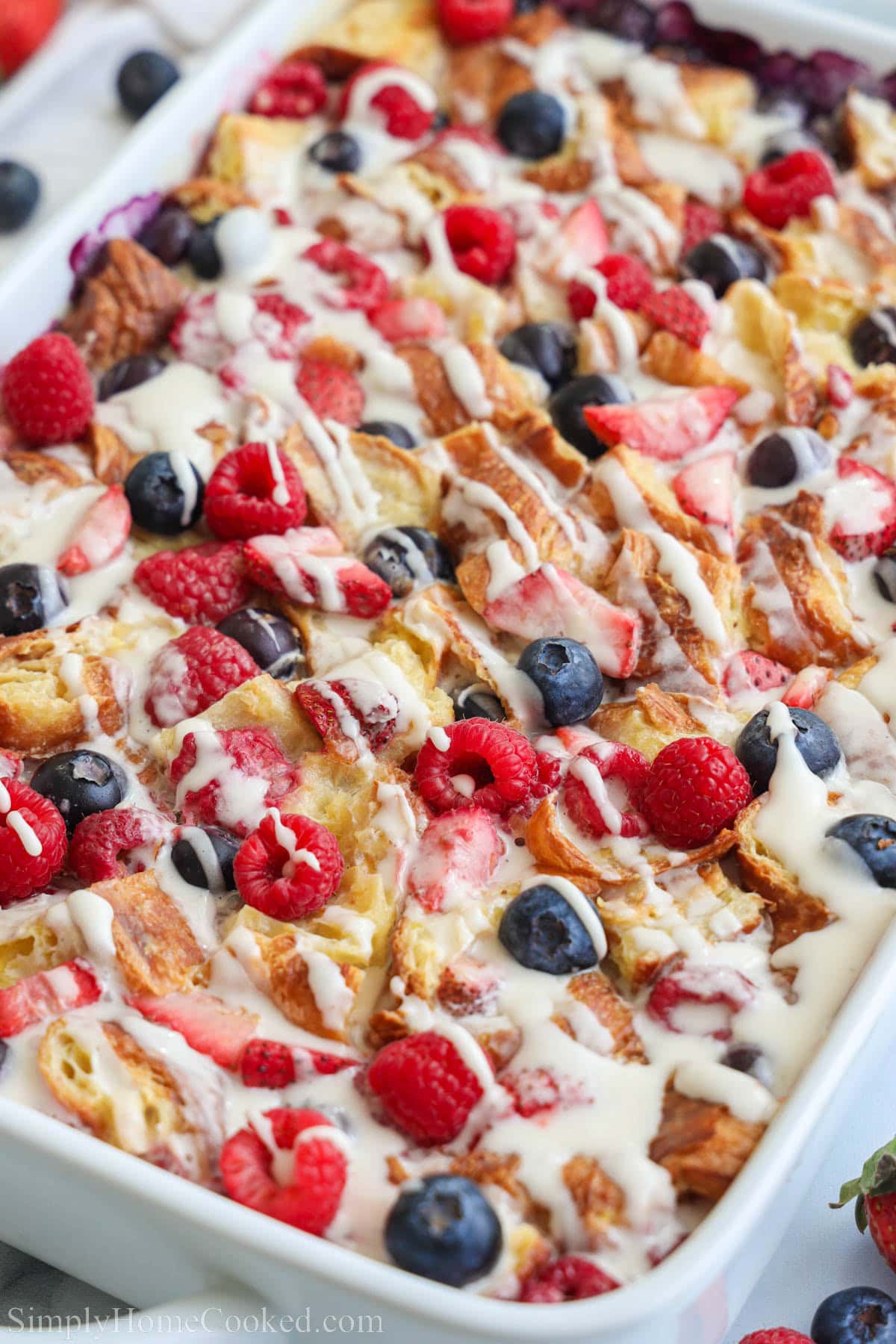 This Sweet Croissant Breakfast Casserole is full of fresh berries, toasted buttery croissants, and rich custard. Drizzled with a lemon glaze, it’s a sweet take on a savory classic.