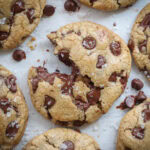 Scoop and chill. Use a large cookie scoop (about 2 oz) to portion the dough into balls. Top each rolled dough ball with a few chocolate chips from the reserved 1/4 cup. Place them on a baking sheet lined with parchment paper, cover the sheet with plastic wrap, and refrigerate for 30 minutes. (Don’t skip this step).