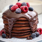 Then pour the hot cream over the chocolate chips and stir with a whisk until the chocolate sauce is smooth. Serve over the chocolate pancakes and enjoy!