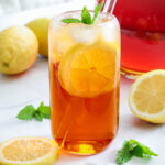 Now stir in 8 cups of cold filtered water, then transfer to a pitcher. Serve the iced tea over some ice and garnish with lemons and mint (optional).